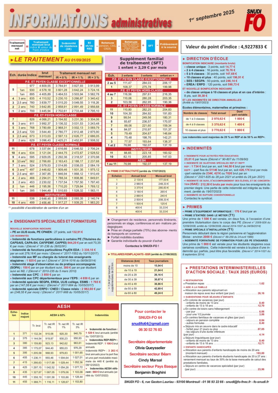 1 septembre 2023https://snudi-fo64.ovh/wp-content/uploads/2024/02/240101-Affiche-administrative-janvier-2024.pdf Calendrier du versement des payes et des pensions en 2025 Les années passent les revendications demeurent, pour les salaires, FO revendique Une revalorisation de la valeur du point d’indice de 10% minimum et le rattrapage des pertes de pouvoir d’achat (plus de 28% depuis…