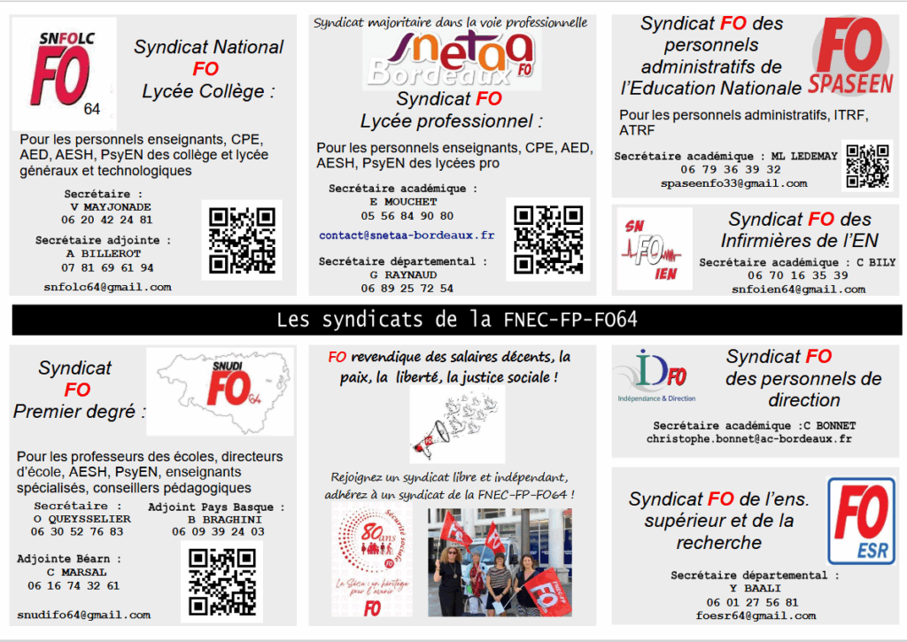 - Dans les instances où la FNEC-FP-FO 64 est élue : CAPD, CSA SD, CDEN, CSA A, Commission spéciale de sécurité, CALR groupes de travail sur les mutations et les promotions.