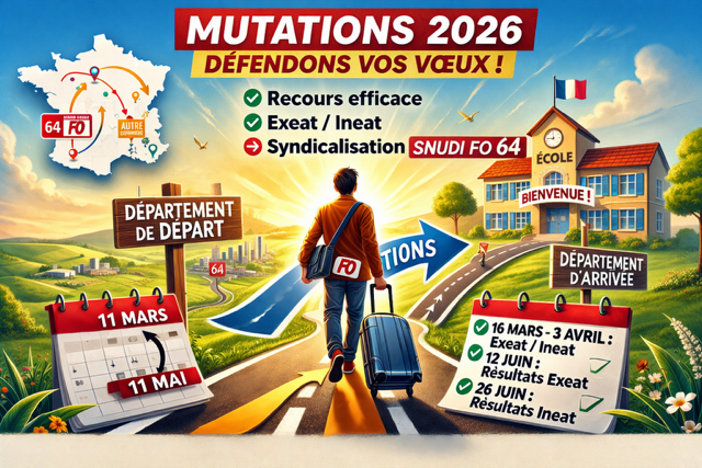 MARDI 27 avril Réunion d’Information Syndicale pour la défense des mutations organisée par les SNUDI-FO 24, 40 33, 47 et 64. Lire ici le communiqué national du SNUDI-FO